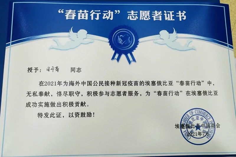 埃塞俄比亞中國商會(huì)爲“春苗行(xíng)動”參與人(rén)員頒發證書(shū)