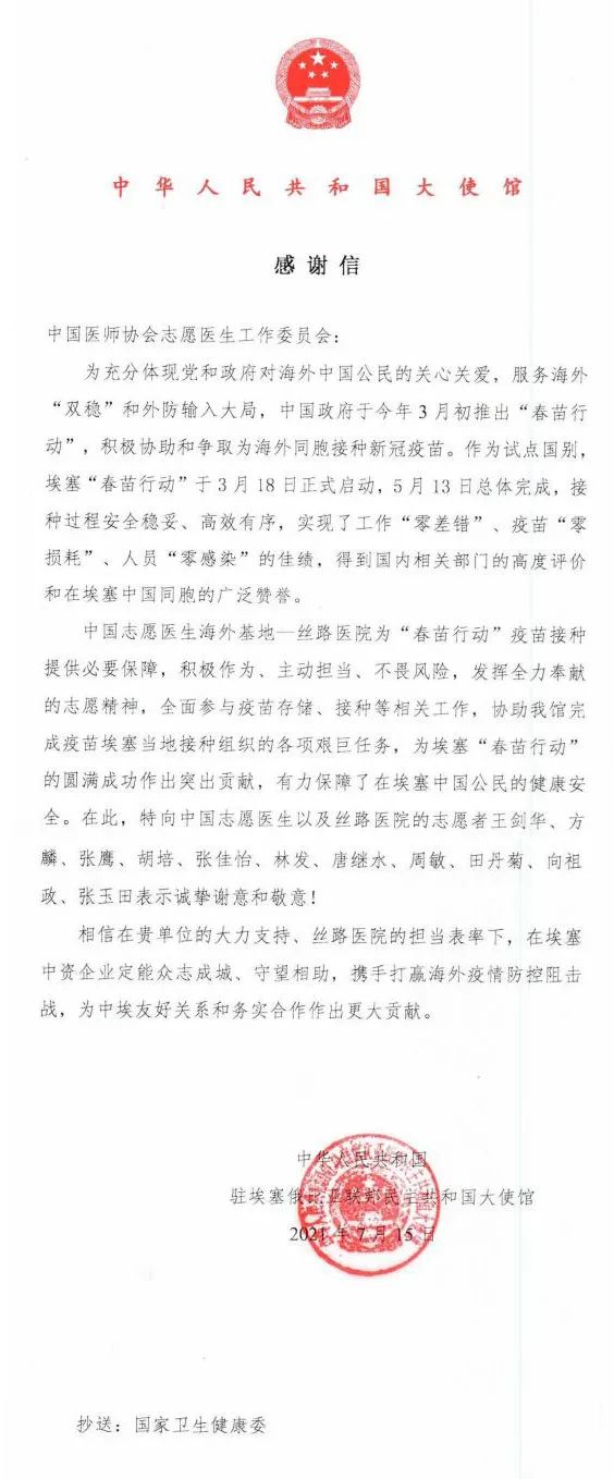 2021年7月(yuè),長沙山水(shuǐ)醫學檢驗所有(yǒu)限公司子公司,湖南山水(shuǐ)華際檢測技術(shù)有(yǒu)限公司積極響應國家号召,與愛菲醫院(絲路(lù)醫院)項目參與人(rén)員一道,配合埃塞俄比亞有(yǒu)關部門以工(gōng)作“零差錯”、疫苗“零損耗”、人(rén)員“零感染”的(de)佳績,圓滿完成了“春苗行(xíng)動”任務。