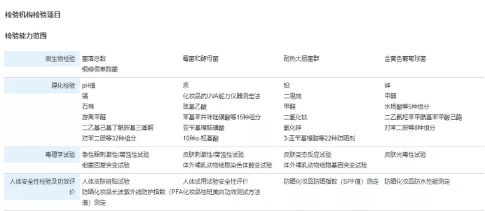 随著(zhe)公司的(de)發展,截止到(dào)目前公司在化妝品檢測領域的(de)檢測能(néng)力參數已達到(dào)671項次,涵蓋化妝品毒理(lǐ)學試驗(如(rú)急性眼刺激性、腐蝕性試驗,皮膚變态反應試驗等)、理(lǐ)化檢驗、微生物(wù)檢驗、人(rén)體安全性檢驗及人(rén)體功效評價檢驗等方面。